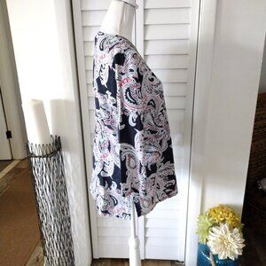 Elevate your wardrobe with this stunning Linen Charter Club Paisley Tunic Top Blouse. This petite size blouse features a flattering V-neckline and 3/4 sleeves with a casual sleeve type. The pullover closure and lightweight material make it perfect for any occasion, whether it's a casual day out, a party, or even workwear. The blouse is adorned with beautiful sequin accents and a gorgeous paisley pattern that adds a touch of bohemian and coastal vibes to your outfit. The multicolor design is perfect for any season and can be paired with any outfit. This blouse is a must-have for any fashion-forward woman who wants to add a touch of elegance to her wardrobe. EUC.