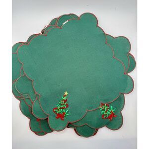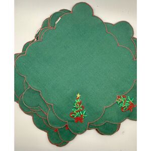 Linen Christmas Napkins Set of 12 Green Embroidered Christmas Tree 7 X 7”
