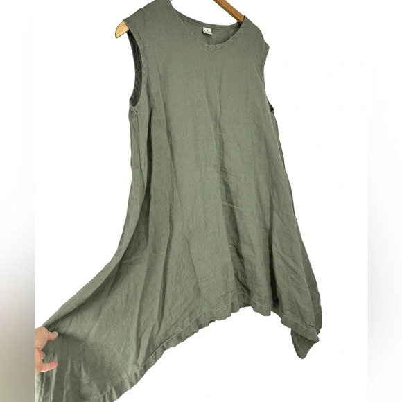 100% Lithuanian linen in sage green. Tank neck with hems longer on the sides. Pit to pit is 21 inches and the length is approximately 35 inches.