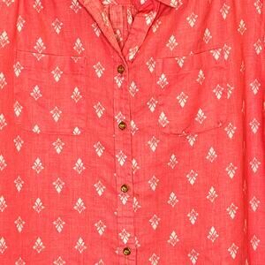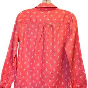 This shirt is a great casual linen piece. Pink with white floral patterns all over. Button down front with gold buttons. Long roll tab sleeves. Size Petite Medium. 100% Linen.