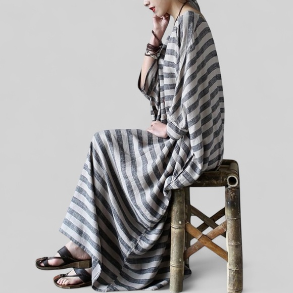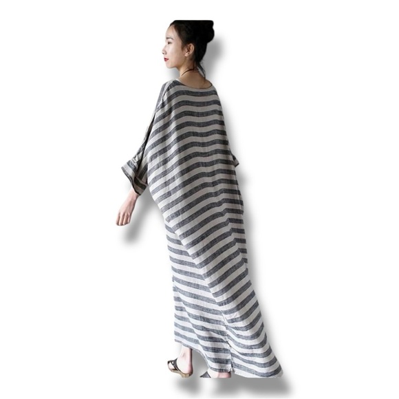 Linen Cotton Striped Caftan Maxi Dress Batwing Pockets Oversized OSFM 32” x 45”