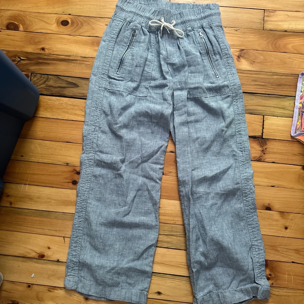 Comfortable blue linen pants with drawstring waist and zippered pockets.