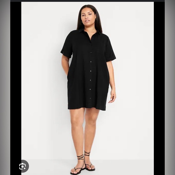 Excellent basic linen dress featuring a collar detail, great pockets and buttons down the front hits at the knee (5’3 for reference) generous with short sleeves. A must have wardrobe staple.