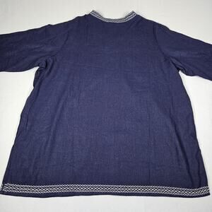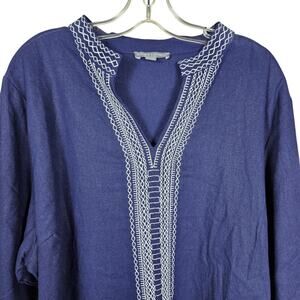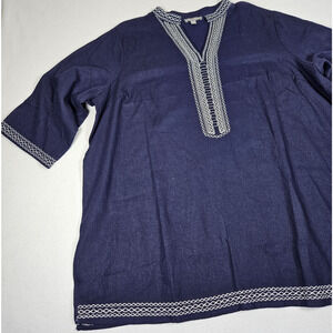 Linen Embroidered V-Neck Tunic Womens 26W Navy Pullover Vacation Beach Boho Top
