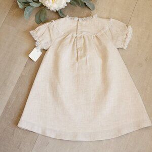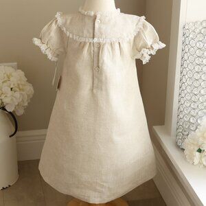 This Little Girl's 100% Linen Dress is most PRECIOUS! The dress is done in a Beige/Flax hue. The float style is timeless and traditional. The front and back have a yoke that is trimmed in a sweet, white vintage eyelash lace. Gathers beneath the yoke form pleats that gently fall down the front of the dress. The short puff sleeves gather with elastic and have a matching lace trim. The back has an upper button closure done in perfectly matching pearlized buttons. The dress is lined with a 100% cotton liner. A perfect dress for Beach portraits. Also great as a Fall Transition Piece! Linen is a year-round fabric that is breathable and stylish. Add a white monogram on the front yoke and a big white hair bow for a traditional preppy look or Pair with beige cable-knit socks and lace-up brown ankle boots for an adorable Fall look! The perfect wardrobe piece for all seasons!! New With Tags!!