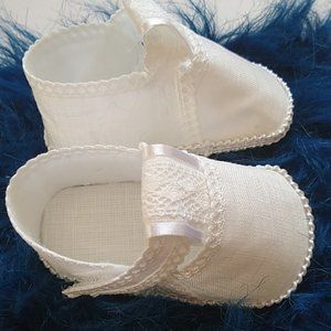 Linen Hand Made unisex baby Booties shoes~ Color: White~ Lace ribbon decoration~ Hand made with Love~ NEW~ Fit approx newborn- 4 months~ pets and smoke free home/ fast shipping! All my articles are sent completely clean.