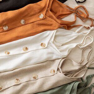 This colorful linen cami with adjustable straps and coconut buttons is the perfect go to summer top! Dress it up or dress it down, it will keep you cool and comfy wherever your summer fun takes you!