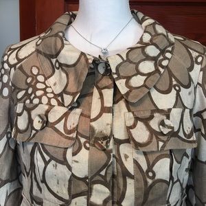 NWT. Super cute. Brown & cream floral with copper metallic threads throughout the 100% linen fabric. Wide ruffle around high waist. Two front pockets. Purchased for my mom at the Houstonian hotel. Although she loves it, browns are not her colors. Boho Chic brand.