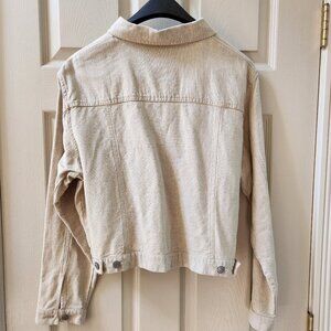 Beige color, 58% linen, 42% cotton, light weight jacket. 22" long, sleeves are 18" long. The jacket has metal riveted buttons and is in great shape!
