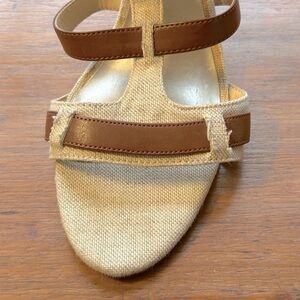 Linen + Leather Heels Tan Women’s Size 8 M NEW Without Box 2.5” Heel Gold Buckle