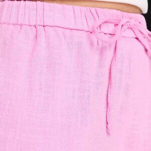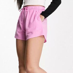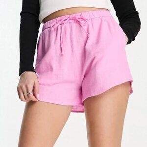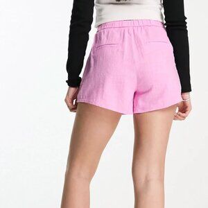 Elevate your summer wardrobe with these stylish Bershka linen look shorts in a fresh pink hue, available from ASOS. Brand new with tags, these shorts feature a flattering high-rise design complemented by an elasticated drawstring waist for adjustable comfort. Equipped with handy side pockets, they offer a regular fit that could also comfortably accommodate a size medium, thanks to their versatile design.