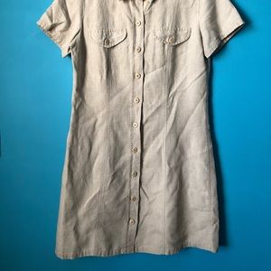Button up, linen mini-dress. Size:8, runs small. Slight discoloration at the bottom.