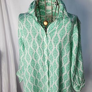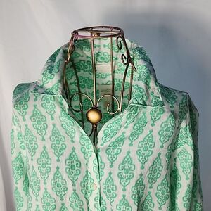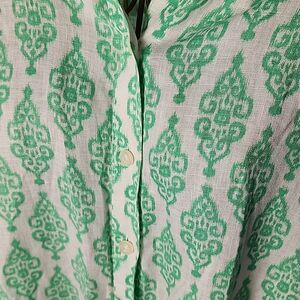 Summer Linen tunic with a mint green pattern on white. Size Chicos 1, which is a regular size 8 to 10