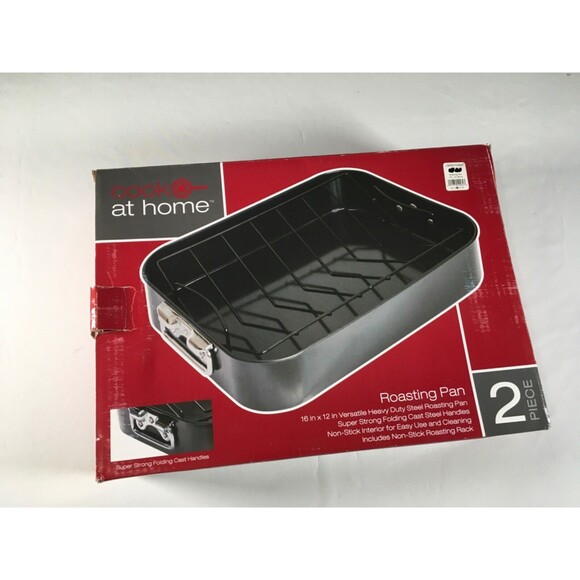 cast steel handles, a non-stick interior, and a non-stick roasting rack.