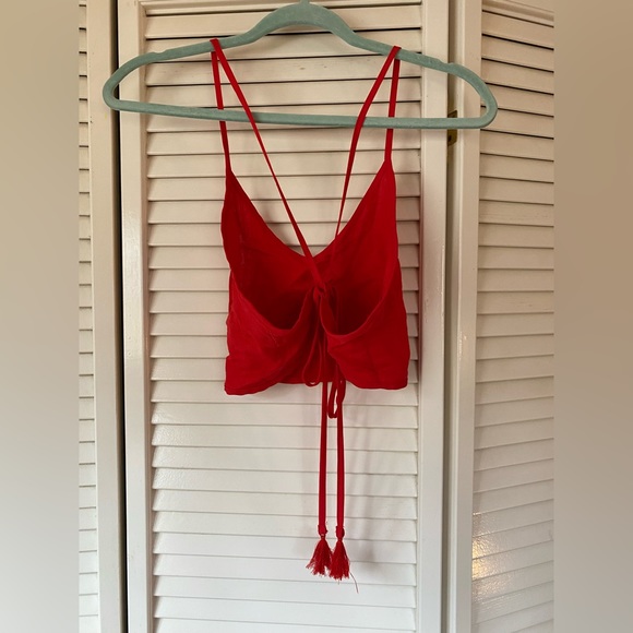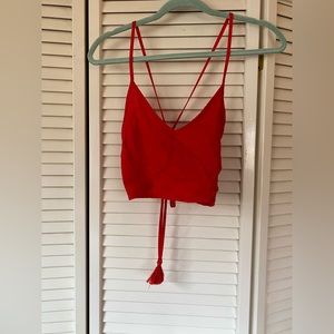 Bright red linen open back tank top. Cute tassel detail on the end of the strings. So cute for summer!