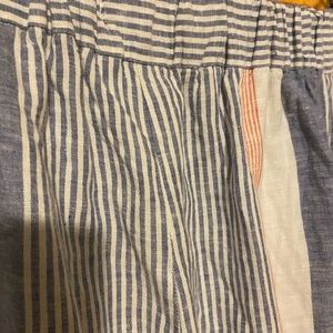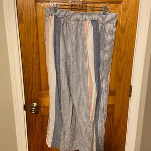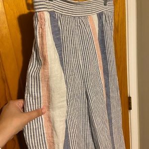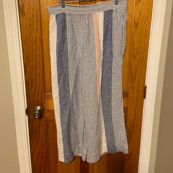 Pretty striped linen pant, wide leg, slit pockets, elastic waisted in back. Very slight pill on the inner thigh.