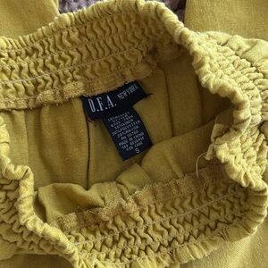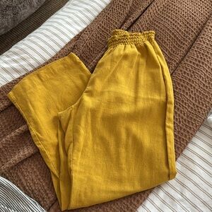 1 mustard yellow - cropped - 50% linen 30% Polyester 20% Rayon - inseam ~ 22 in waist 10 in