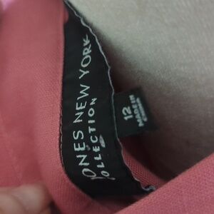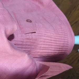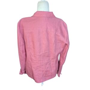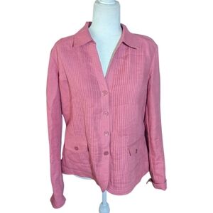 This Jones New York 100% linen blazer in a muted terra cota color is crafted with vertical mini box pleats down the front offering a relaxed fit and classic collar design. Its hip-length cut makes it a versatile piece for any casual occasion. v neck. hip button closure patch pockets
