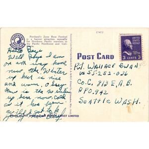 Genuine linen-era postcard depicting the Rose Garden in Washington Park, Portland, Oregon. Published by E. C. Kropp Co. of Milwaukee, Wisconsin, card number 17472. The back includes promotional text about Portland's June Rose Festival and the Northern Pacific railway. Postmarked with a 3¢ Thomas Jefferson stamp and addressed to Pvt. Wallace Swan. Divided back and printed in natural color.