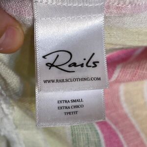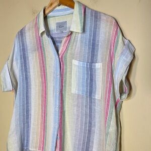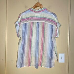 Casual button-up top with multicolor stripes. Features short sleeves and a chest pocket. Lightweight and stylish.