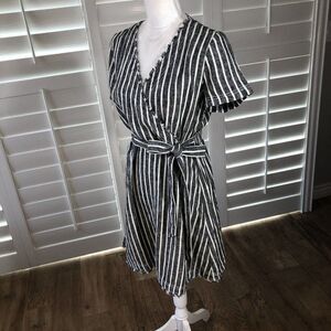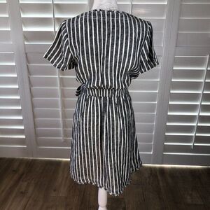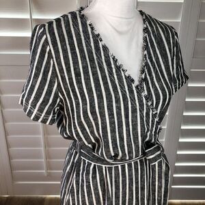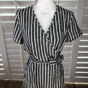 Very pretty Susina linen/rayon surplice/mock wrap knee length dress. Short sleeve, blouson with tie at waist. Washed out black/gray and white vertical stripes with a raw frayed hem. A-Line easy fit skirt. Like new condition. No flaws. Size small but runs a bit big.