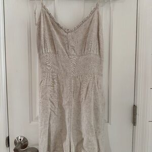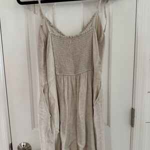 Spaghetti strap tan linen romper with pockets! Beautiful details around neck. Smocked back. Super soft!