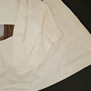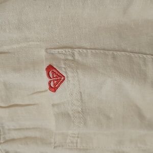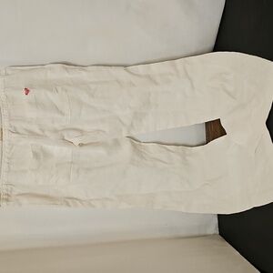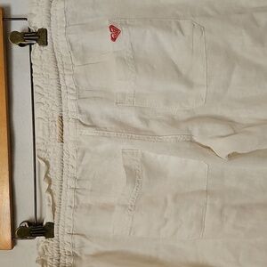 Roxy White Linen Pants. Elastic Waistband with Rope Drawstring. 2 Side Pockets. Flared Leg. 2 Rear Pockets. Size Large. Excellent Condition! Waist 34. Inseam 33. Flare Leg 11. Rise 10