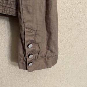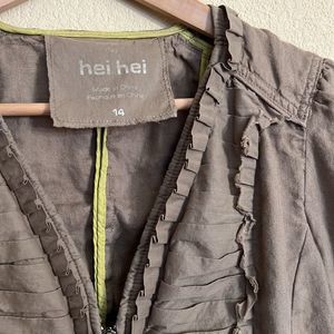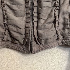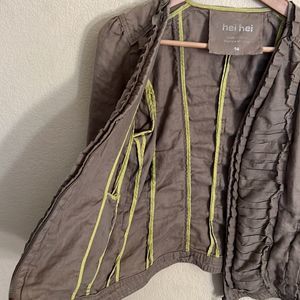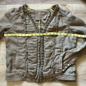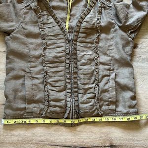 Army Khaki linen zip up jacket. Pleated material and ruffle accents on this light weight jacket perfect for spring and summer. Yellow accent liner and front pockets.