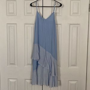 Super cute ruffle A line dress! Perfect for summer! Lightweight, breezed and super flirty. V neckline in the front and back. Blue linen body with lightweight blue striped ruffles. Worn a few times, no sign of wear.