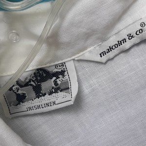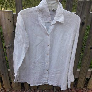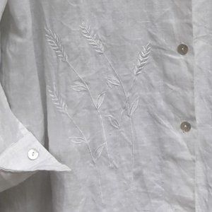Linen Shirt Vintage White Button Down Blouse Irish Linen Top with Pearly Buttons and an Embroidered Accent on the lower front side of some leaves or wheat in same color thread as the blouse. Collar, Long Sleeves, Slight slit on both sides at bottom. Great top! ***Please note I noticed a touch of yellowing on this top due to age so am temporarily pulling it from active listings while laundering it or possibly may dye it a new color. Or make am offer for as is.***