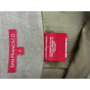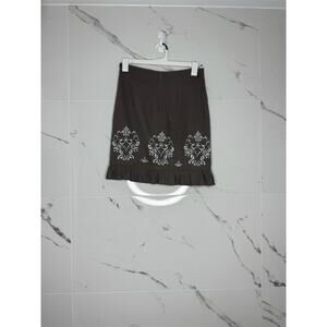This linen skirt in size S is perfect for a casual occasion with its knee-length ruffle embroidered design. The brown floral pattern gives it a bohemian and hippie vibe, making it ideal for summer festivals. The high-quality fabric and side zipper detail add a touch of elegance to this straight and pencil style skirt from San Francisco. Ideal for women looking for a neutral and summer-themed addition to their wardrobe.