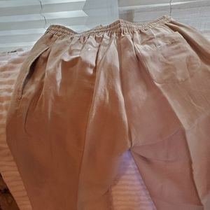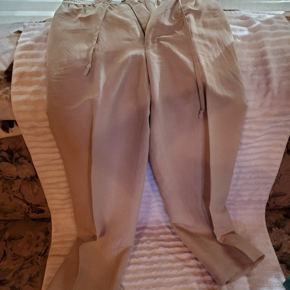 Tan, drawstring with button and zipper, linen and silk slacks, very soft