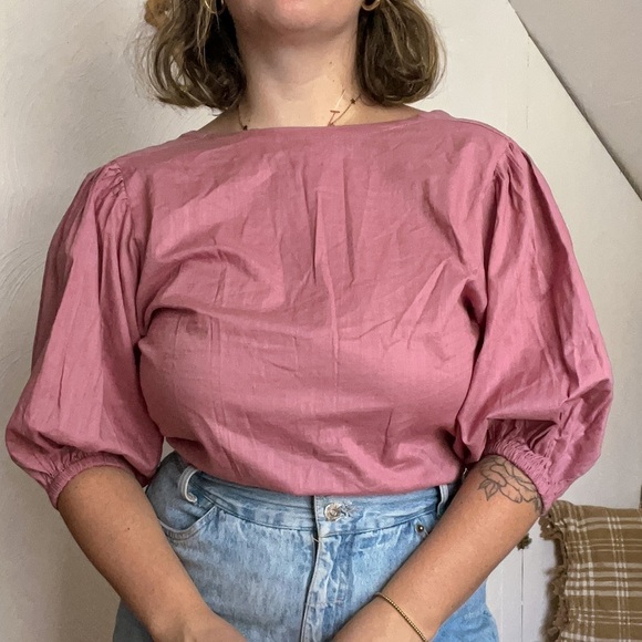 Unsure of brand. Small/medium. 100% linen. Could be worn front or back