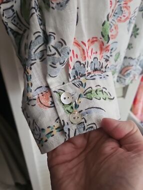 Beautiful floral in lighter colors on white. Tabs for sleeve roll up as pictured or nicely cuffed for full long sleeves