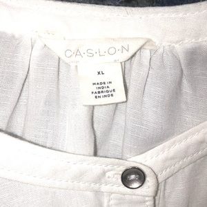 White, linen tunic, with long sleeves, that can be rolled up and secured with a tie and button (see picture).