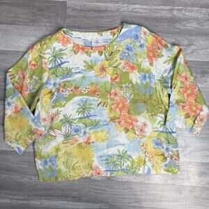Hot Cotton brand by Marc Ware 100% linen top featuring a pastel floral tropical print. Made in the USA, this lightweight blouse has a breezy, boxy silhouette with a crew neckline and relaxed 3/4 sleeves. Easy to throw on for warm-weather days, vacation styling, or cottagecore looks. Beautiful watercolor palette with green, coral, yellow, and sky blue tones. Good Condition a few snags