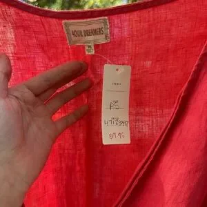 Never worn wrap dress from Anthropologie. Linen fabric for a natural soft look, and relaxed ruffles give a feminine touch. Wrap allows you to tie it tighter or looser. Tags still on. Color is red with a pink base.