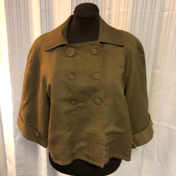 Linen/rayon short jacket with Raglan 3/4 length sleeve with cuffs. 46”chest. Back length 20”