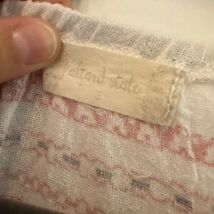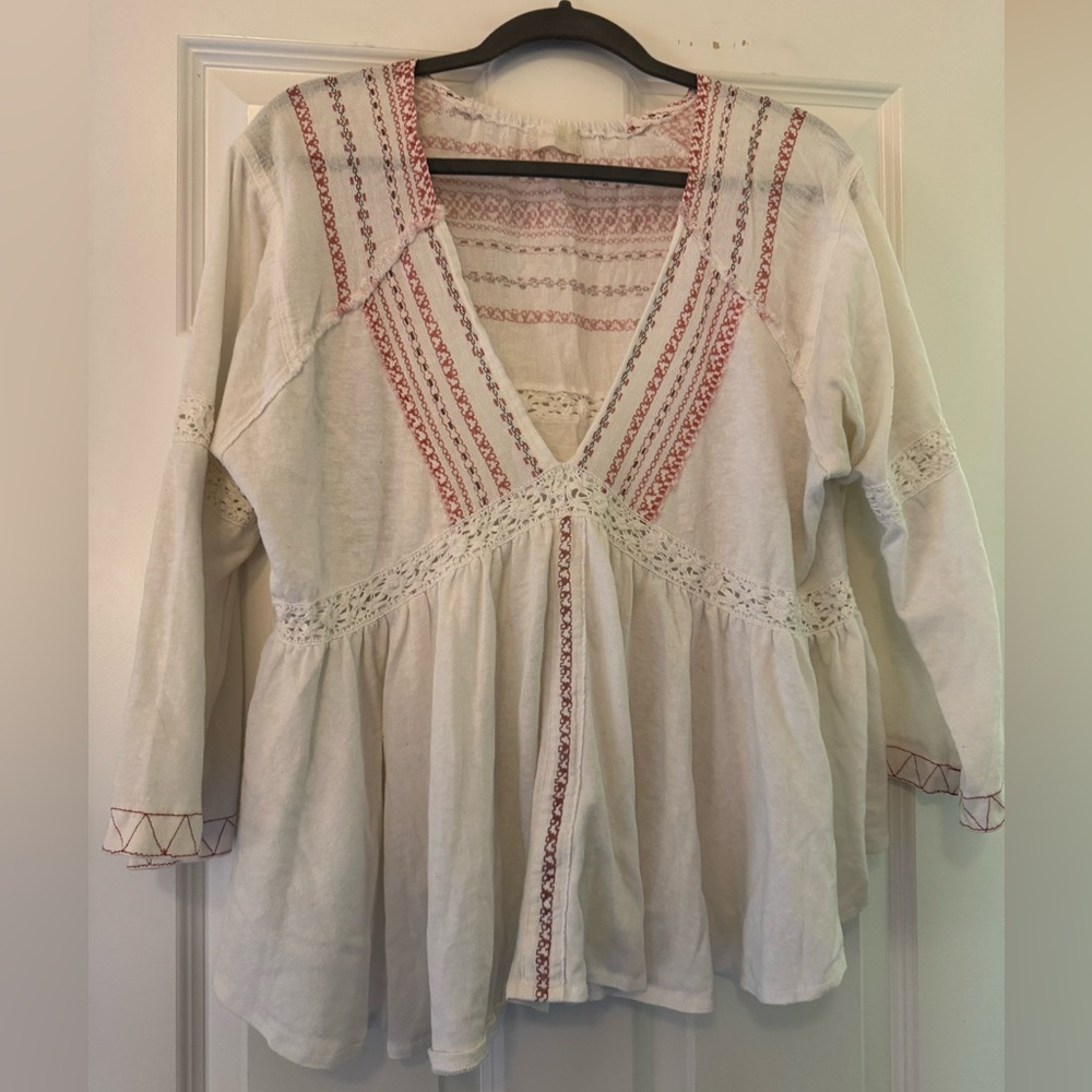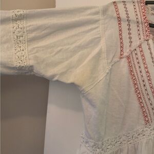Beautiful linen, flowy blouse with a V neck design, lace details, size S but fits more like a L so listing as a Medium. Only imperfection is the underarms, see picture, I haven’t stain treated it.
