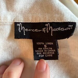 Short sleeve, slightly cropped, linen button down collared top. Has some very minor discoloration (pictured) absolutely not noticeable when worn. 100% linen. Fits small to XS best imo