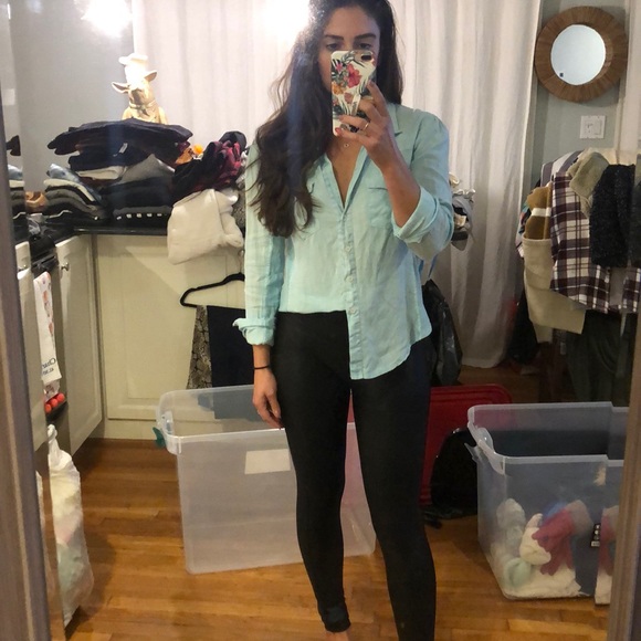 Sky blue linen button up perfect with white jeans or leggings for a more casual look! Lightly worn.