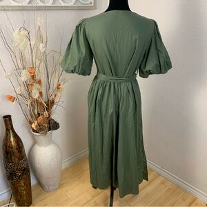 Linen / cotton olive green , balloon puff sleeve, wrap tie dress