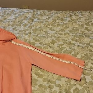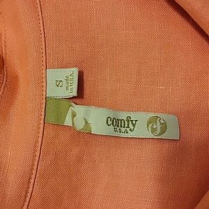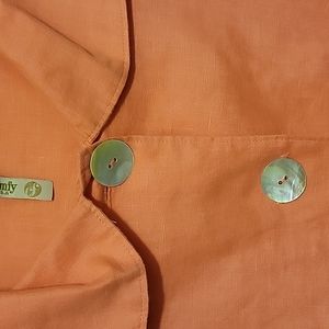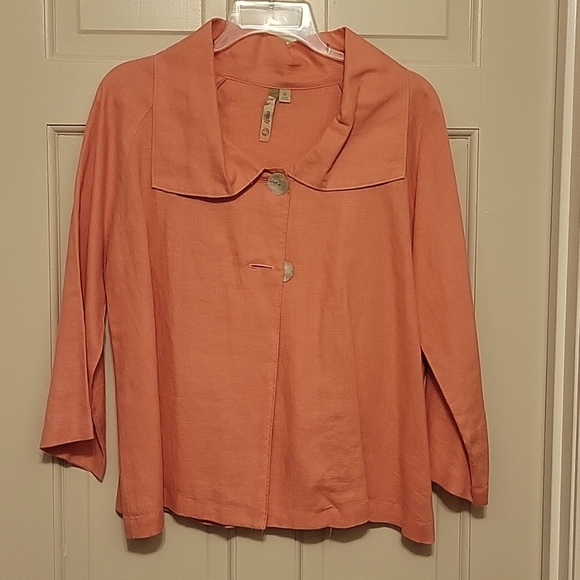 Comfy brand coral linen jacket. Unlined, 3/4 sleeve. Fabric is soft, fit is swing-loose. Made in USA. Good used condition.