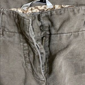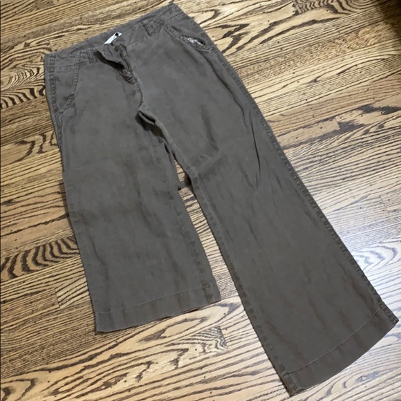 Tan, wide leg front pocket linen pant. Short depth pockets in back