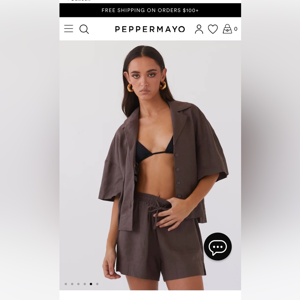 Shorts and button up brown linen set. New with tags. Unworn and comes in original packaging. $115 value from peppermayo. Size 0 in both top and bottom