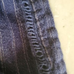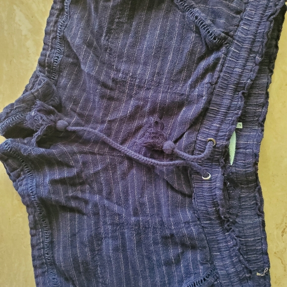 Maurices linen shorts. Navy in color fine tan blue pin strips. Front and back pockets. Very comfortable. Small hole in detailing along seam. Easy fix
