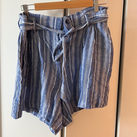 Side pockets. 95%linen 5% viscose. Blue and white. Zíper and clasp in the front with belt tie.