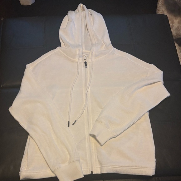 White. Like new. Light weight. Has pockets