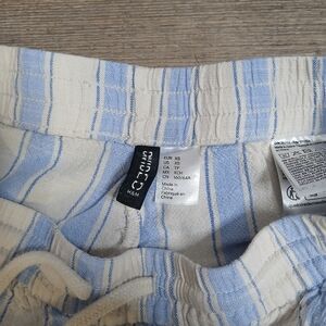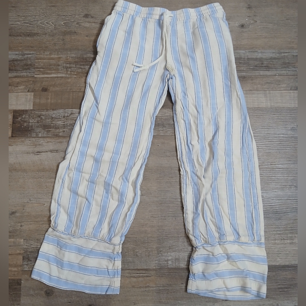 Comfortable lounge pants with blue and white stripes. Perfect for casual wear.