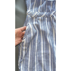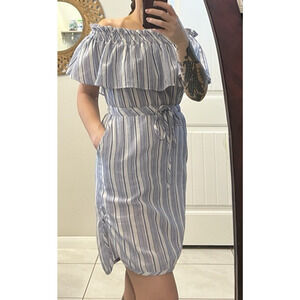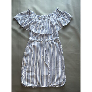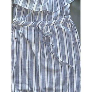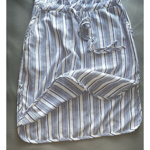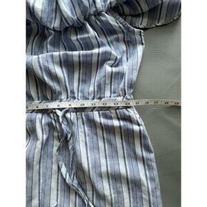 LinenLux Medium summer time dress/cover up. White cotton/poly blend with blue stripes. Elastic ruffled/flutter shoulders, a drawstring waist and pockets! Approx measurements are